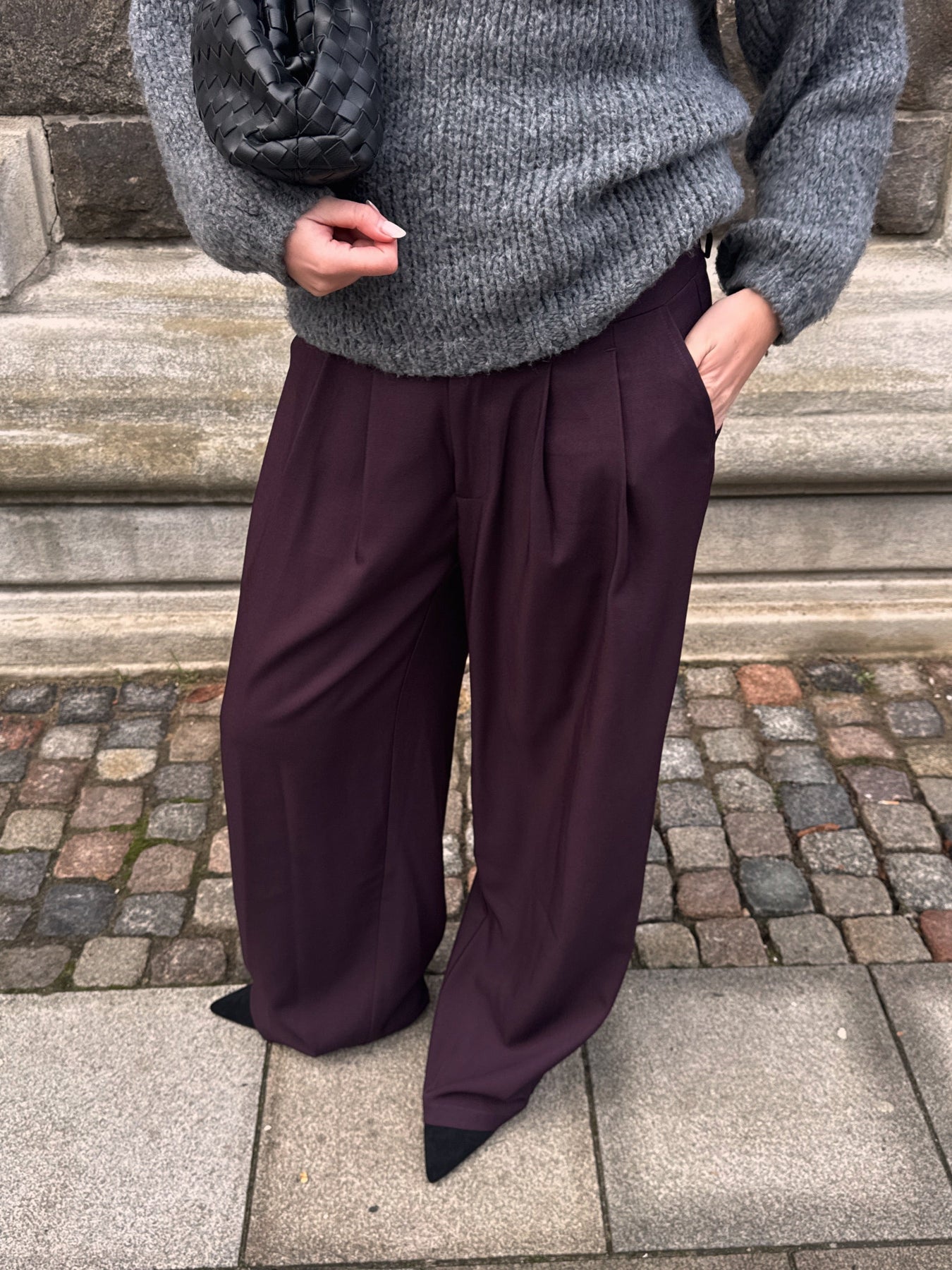 De her bukser er til dig, der elsker et afslappet og stilrent look. De har en bred, baggy pasform med læg foran, som giver et flatterende fald og masser af bevægelsesfrihed. Taljen sidder komfortabelt og kan nemt styles både højt eller lavt, alt efter hvilket look du går efter.