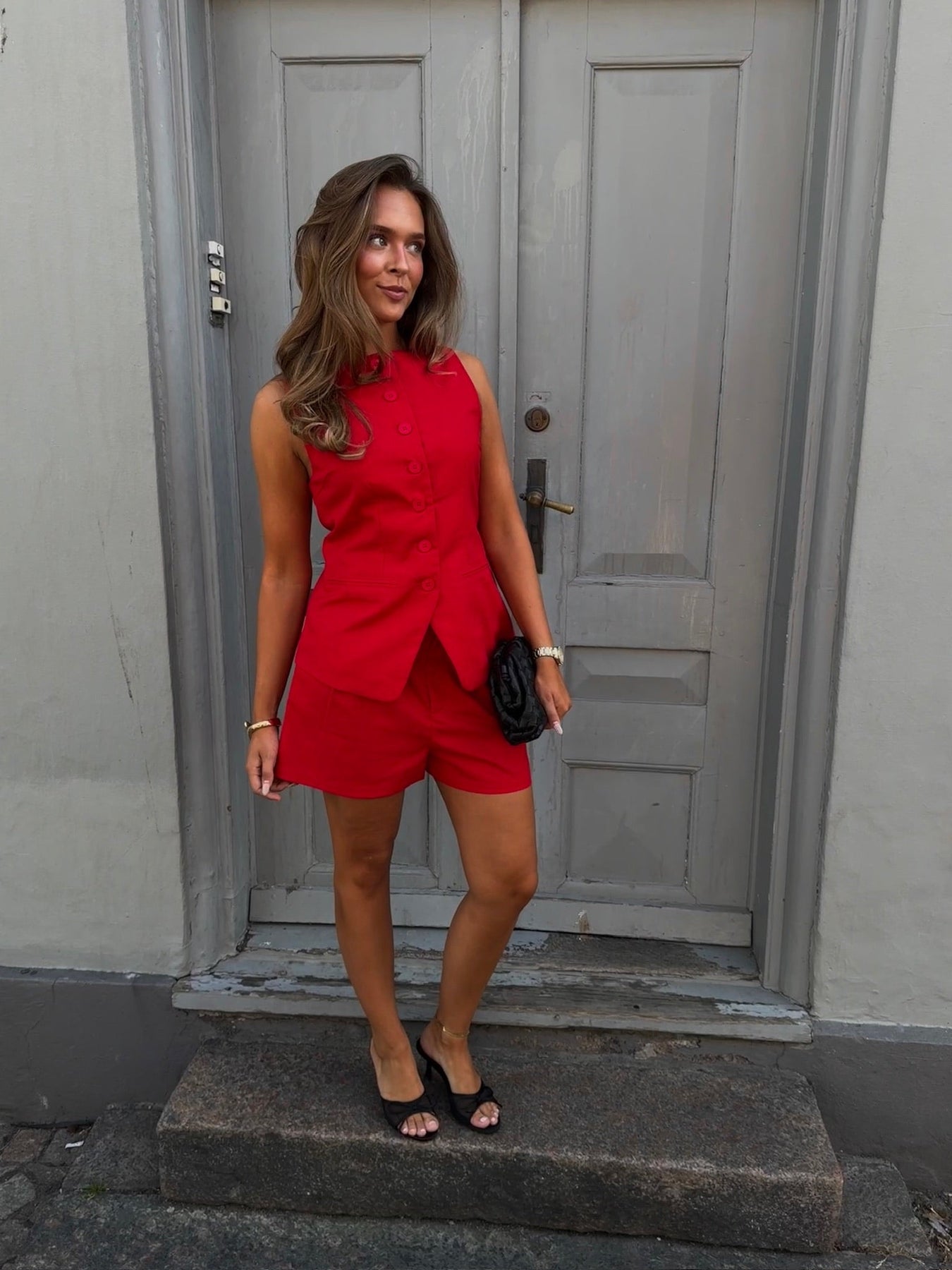 En elegant og figursyet vest med et skarpt, feminint snit og karakteristisk knaplukning langs fronten. De diskrete lommedetaljer og den buede kant forneden tilføjer et klassisk touch med moderne kant.