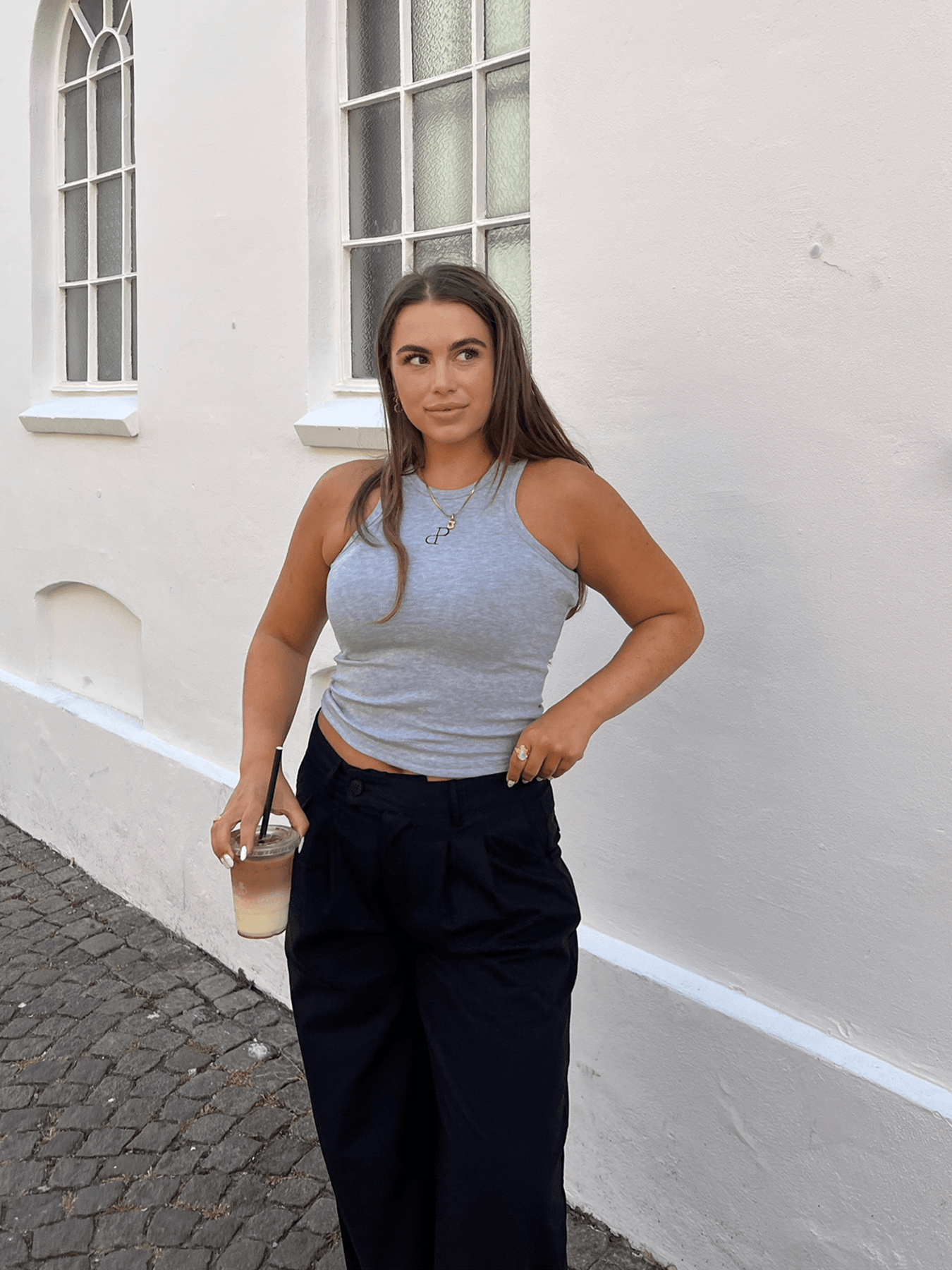 En enkel och tidlös topp med figurnära passform och en hög, rundad hals. Designen framhäver axlarna och skapar en sportig men ändå feminin look. Den korta längden gör den idealisk till byxor, shorts och kjolar med hög midja.