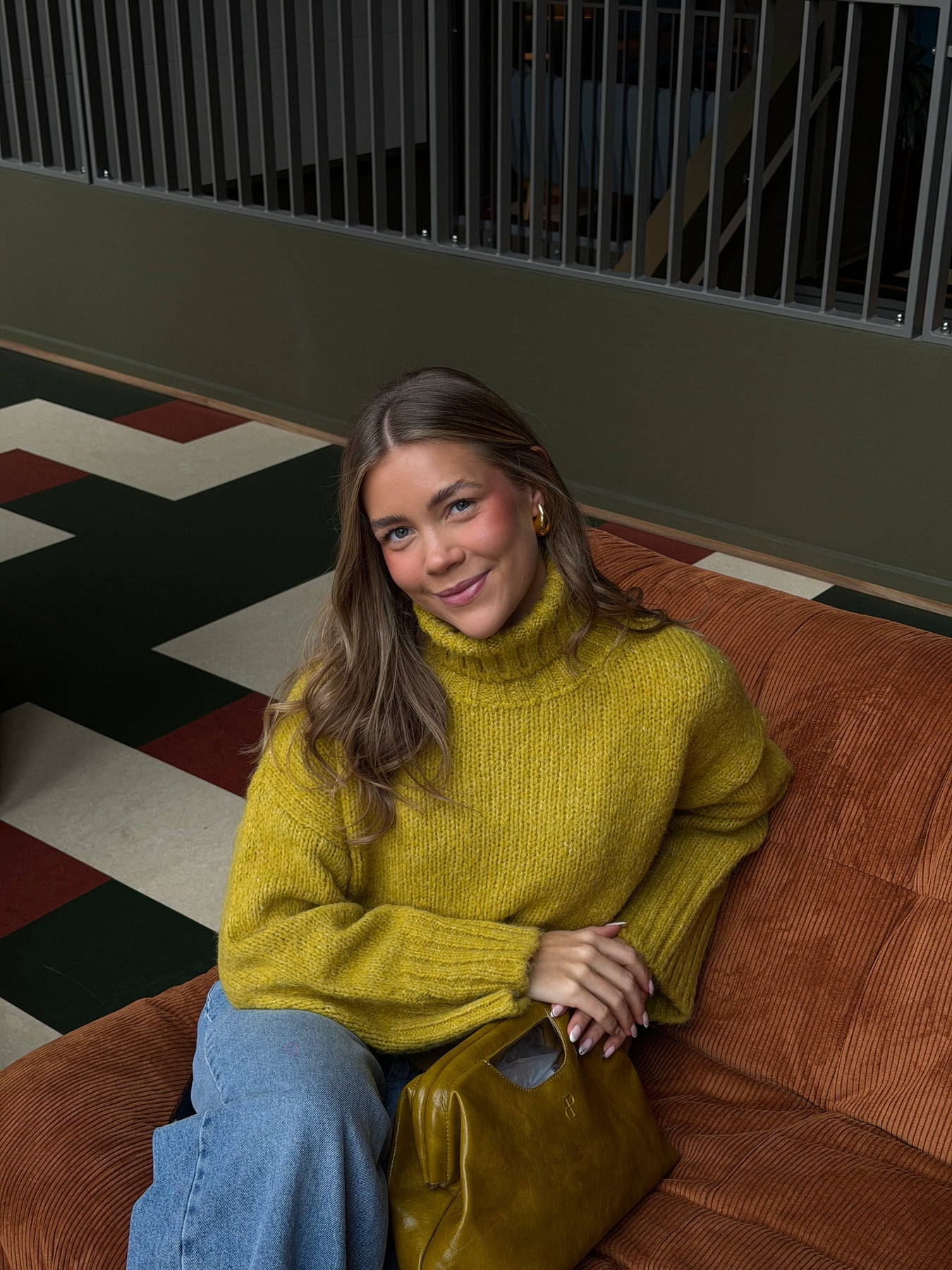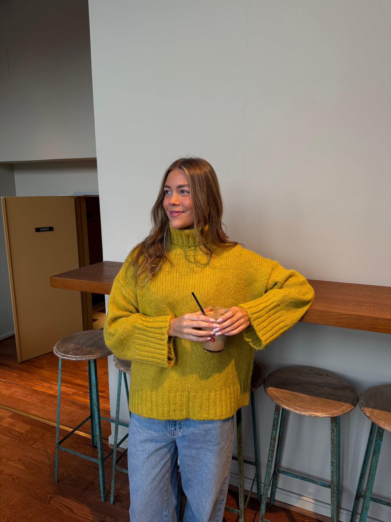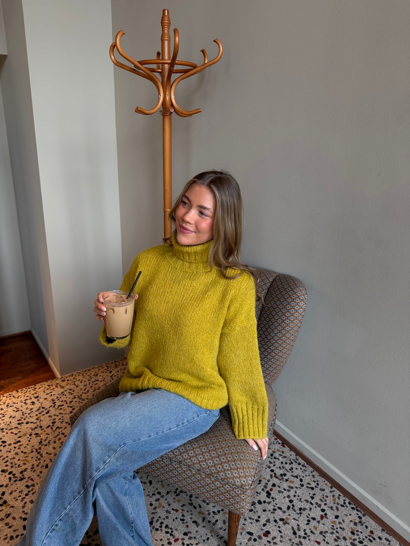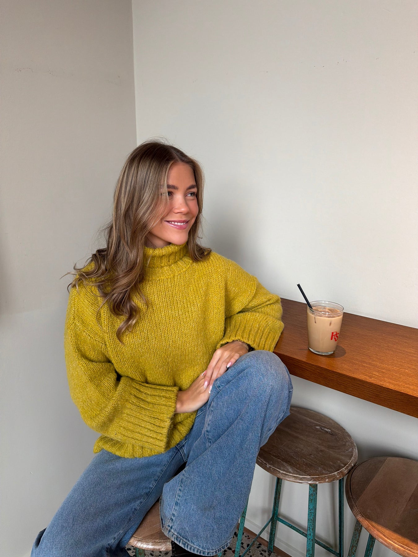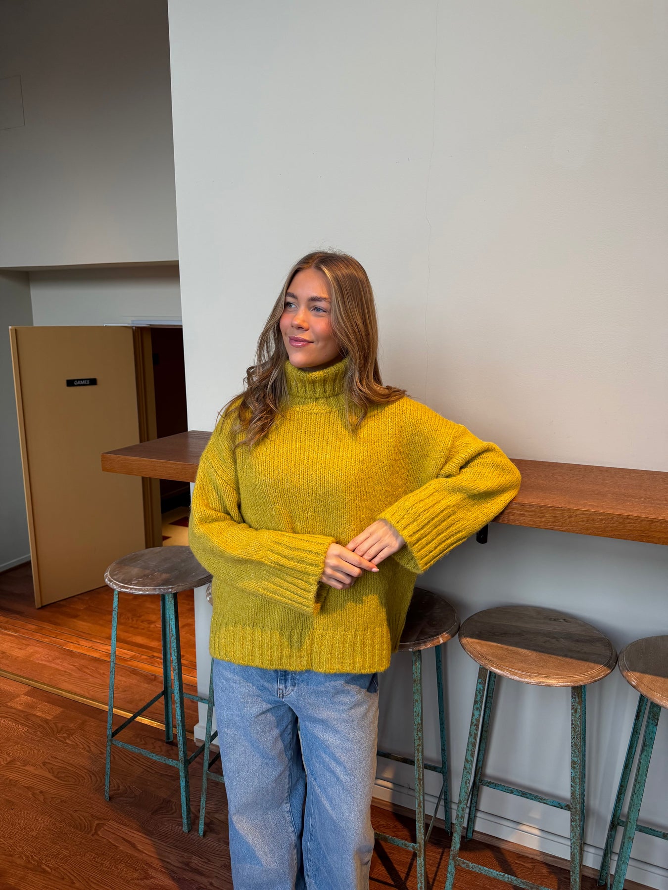 Denna stickade tröja är designad för att bli en bas i din garderob. Den har en avslappnad passform med hög halsringning, vilket skapar en modern och bekväm look. De breda ribbade kanterna vid ärmar och fåll ger en exklusiv touch till den enkla designen.
