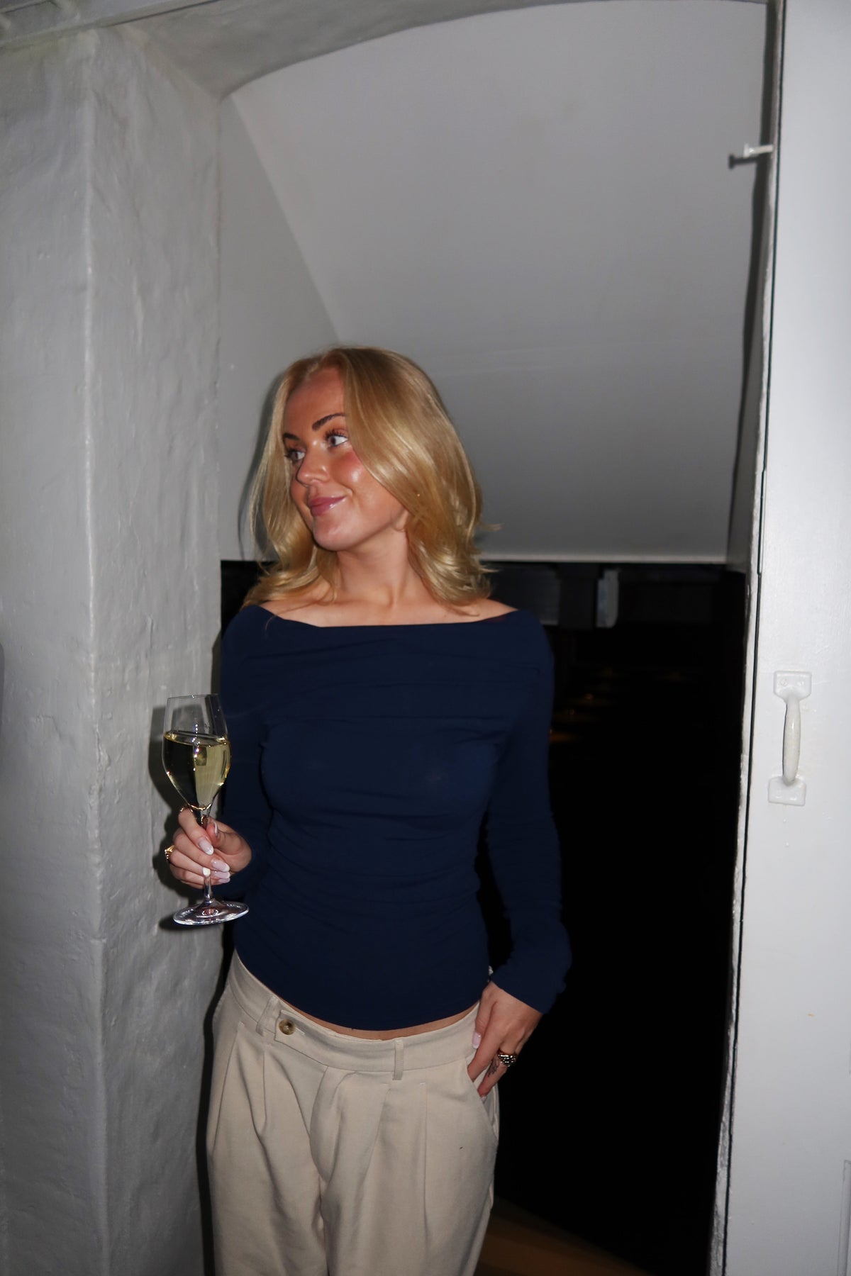 Toppen är tillverkad i ett mjukt, stretchigt material som smickrande följer kroppens former och ger en bekväm passform. Den minimalistiska designen med den draperade urringningen bak ger en feminin och sofistikerad känsla, perfekt för både festliga tillfällen och mer avslappnade sammanhang.